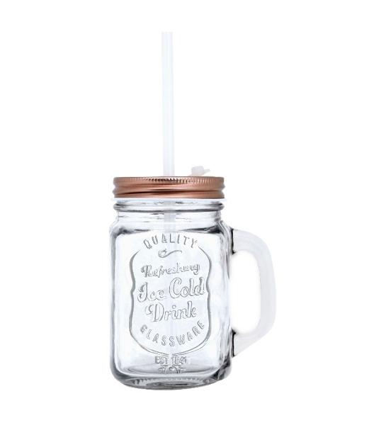 1 Copo de Vidro Retrô com Tampa e Canudo Bronze